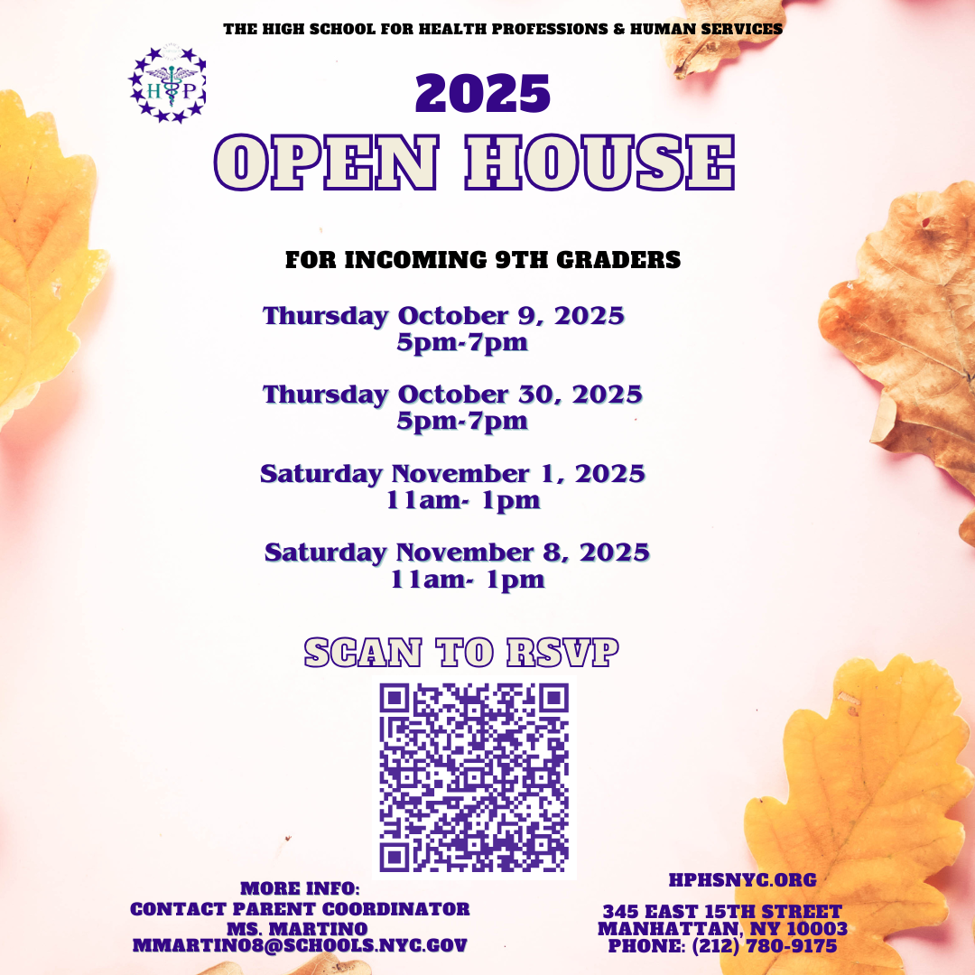 We are thrilled to announce several upcoming dates that will give you and your child an opportunity to see and learn more about The High School for Health Professions & Human Services. You are cordially invited to join us for our Open House events on the following dates: